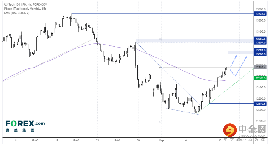 纳斯达克100指数连续4天上涨,创下两周高点。4小时图仍处于强上涨趋势,且一直以来回调幅度都非常小,强调了趋势的力度。看涨吞噬K线的形成,表明12,570一线筑有买需。所以,守住该位我们继续看涨。如果美国通胀确实回落,价格后市或剑指13,000。