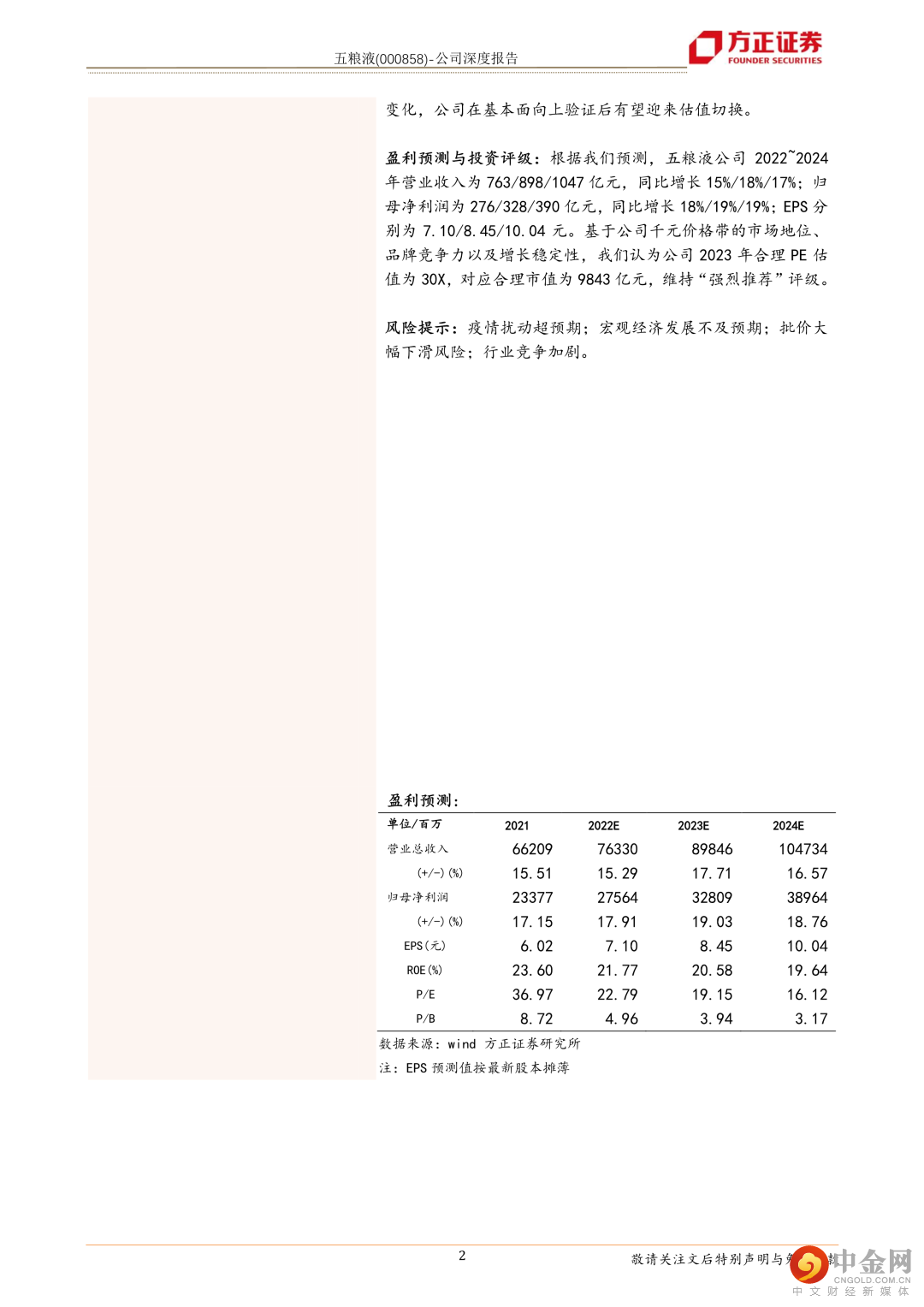 盈利预测与投资评级:根据我们预测,五粮液公司2022~2024年营业收入为763/898/1047亿元,同比增长15%/18%/17%;归母净利润为276/328/390亿元,同比增长18%/19%/19%;EPS分别为7.10/8.45/10.04元。基于公司千元价格带的市场地位、品牌竞争力以及增长稳定性,我们认为公司2023年合理PE估值为30X,对应合理市值为9843亿元,维持“强烈推荐”评级。