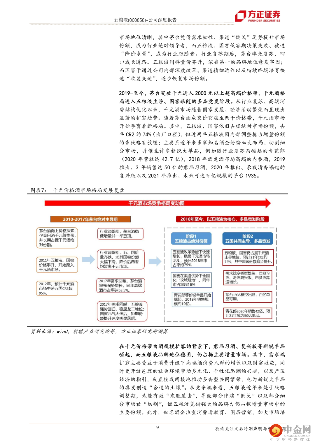 白酒千元价格带赛道系“长厚雪坡”,且竞争格局清晰,公司凭借品牌优势与渠道改革有望挤占更多的增量份额。白酒千元价格带细分市场是由我国经济发展催生、居民财富支撑的优质赛道,尽管行业发展初期遭遇波折,但该赛道供给端的高壁垒与需求端的长逻辑共同决定其本质为“长厚雪坡”,故我们认为随着中国崛起之势愈发明确,该细分赛道也将在充满不确定的未来中“行稳致远”。而公司作为千元酒第一品牌长期占据主要的增量份额,未来公司将立足核心品牌优势,并梳理量价节奏与精细化市场运作,有望切割更多的增量市场,扩大品牌优势。