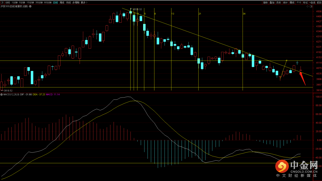 沪深300回落到下降趋势线附近后出现支撑,短期需要关注是否再次跌破的可能,如果出现则可能再次向下创出新低。