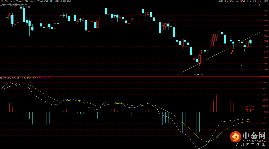 大盘跳空低开向上反弹无力,短期需要注意观察后续三天是否能够回补缺口,如果无法回补则大概率会出现再次下行走势,而下方支撑则可能出现在3155到3172点附近。