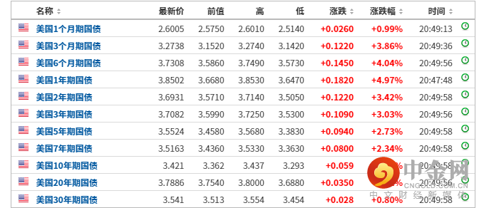 美国债市亦全线杀跌,美国国债收益率飙升。