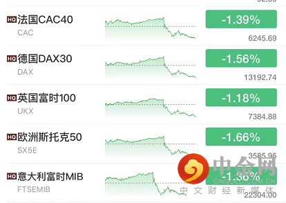 欧股收盘全线下跌,德国DAX指数跌1.59%报13188.95点,法国CAC40指数跌1.39%报6245.69点,英国富时100指数跌1.17%报7385.86点。