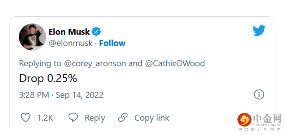 当地时间周三,全球首富马斯克直接点赞伍德的观点,马斯克在推特表示,美联储应该“降息0.25%”,美联储激进加息将导致美国经济陷入通缩。