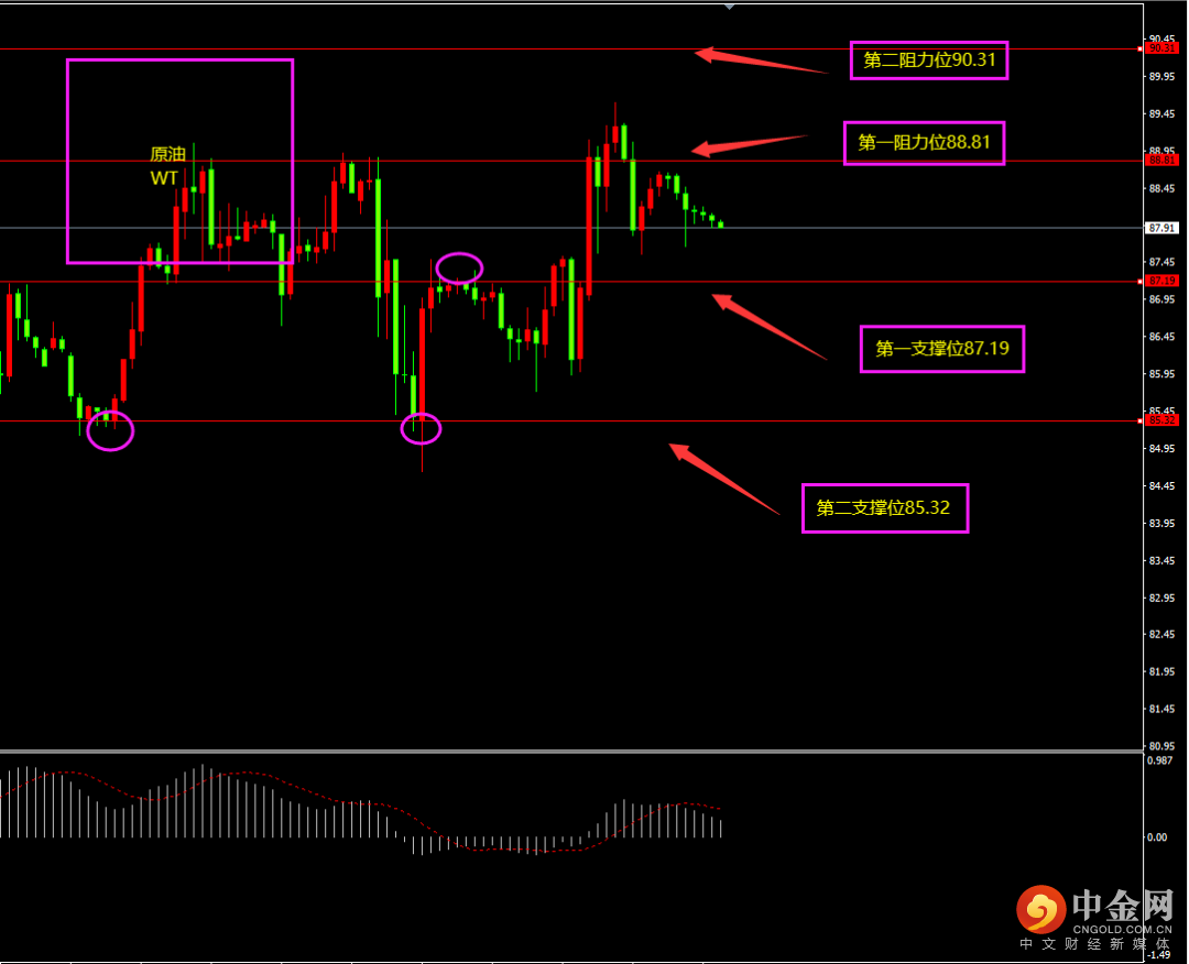 原油昨日收阳线,价格有所冲高,但实体部分较小,多头力度不强,短期连续冲高后面临调整,且MACD位于0轴之下,空头仍在,日内更多以逢高看空为主。小时图原油期间虽有部分大阳线冲高,但上方亦有大阴线回落,空头仍在,短期上行力度减弱,且上方震荡高位未破,日内更多试探性以逢高看空为主?
