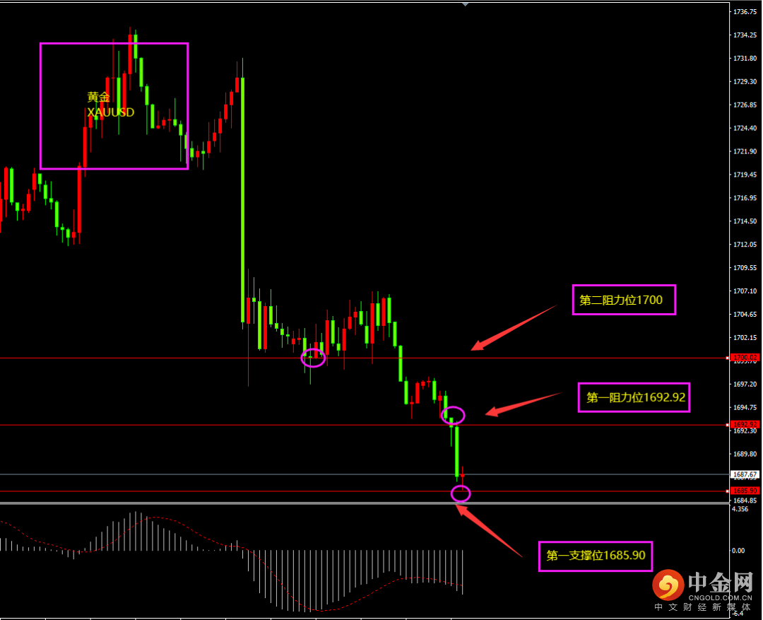 天图黄金收小阴线,价格小幅回落,空头有所增强,短期再度接近震荡低位而价格未形成维稳,多头大幅减弱,短期MACD位于0轴之下,空头占优,日内更多以逢高看空为主。小时图黄金期间虽形成底背离,但底部未形成阳线维稳,多头不强,日内更多以逢高看空为主?(大阳线不出,多单不入)