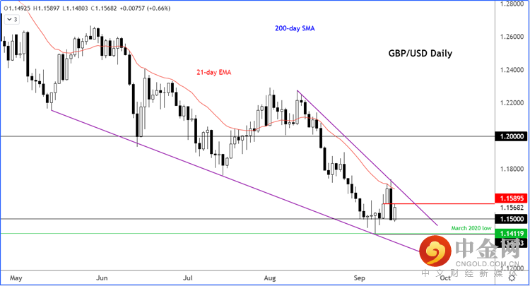 此文发稿时,英镑/美元在测试周一以来低点1.1590一线,那是前支撑位,在周二告破后或转变为阻力。如果空头在此处入场,或推动价格跌至1.15。如果进一步下跌,可能下看于上周遭到考验的、略高于1.14的2020年3月低点。