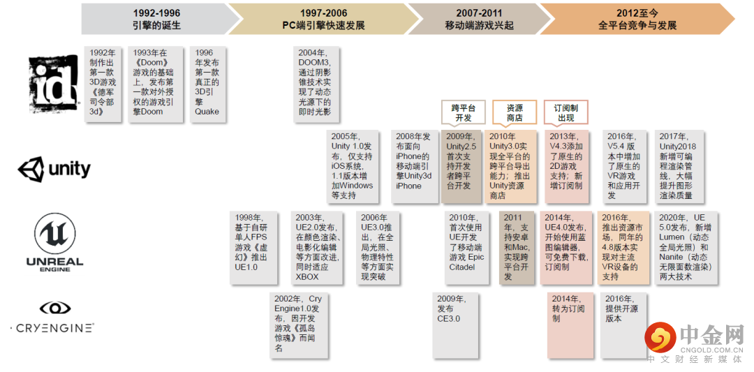 游戏引擎的诞生源自自研游戏开发,中长尾开发者需求驱动商用引擎发展。1993年,由于开发成本较高,id公司将其游戏DOOM所使用的引擎对外商业授权销售,这是第一款脱离游戏单独对外发售的游戏引擎。2000年前后,伴随着OpenGL和微软DirectX标准的推广,以及3D显卡技术的更新迭代,市场上涌现出了Cry Engine(简称CE)、虚幻引擎(Unreal Engine,简称UE)、Lithtech等一系列基于游戏厂商自研游戏的商用引擎产品。2007年,iPhone发布,移动端游戏兴起带来的小型团队和独立设计师的开发需求驱动商用游戏引擎快速发展。近年来的主机、VR、AR等多平台竞争也促使游戏引擎厂商不断迭代技术加强实力。