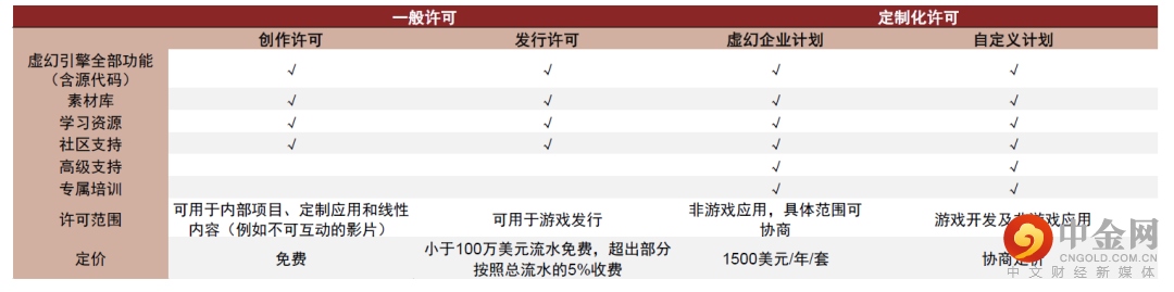 在销售许可模式上,虚幻引擎按照收入分成收费。虚幻引擎按照许可的范围进行价格划分:对于内部项目、定制应用和不可互动的线性内容,用户可免费使用虚幻引擎进行制作;但对于游戏发行,标准化的虚幻引擎收费模式对超出100万美元的流水部分按照总游戏流水的5%进行收费。相较Unity按照座席收费,人数众多的大型游戏开发团队更倾向于与Epic公司签订定制化的虚幻引擎许可计划以降低费率。