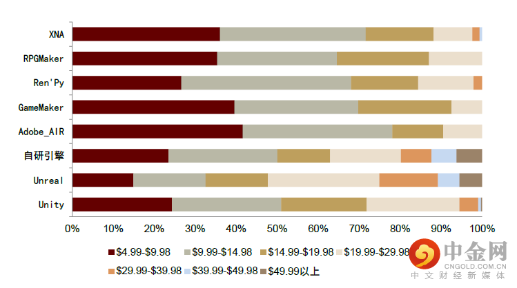 图表:使用不同引擎的Steam游戏数量(按照发行价划分),2021