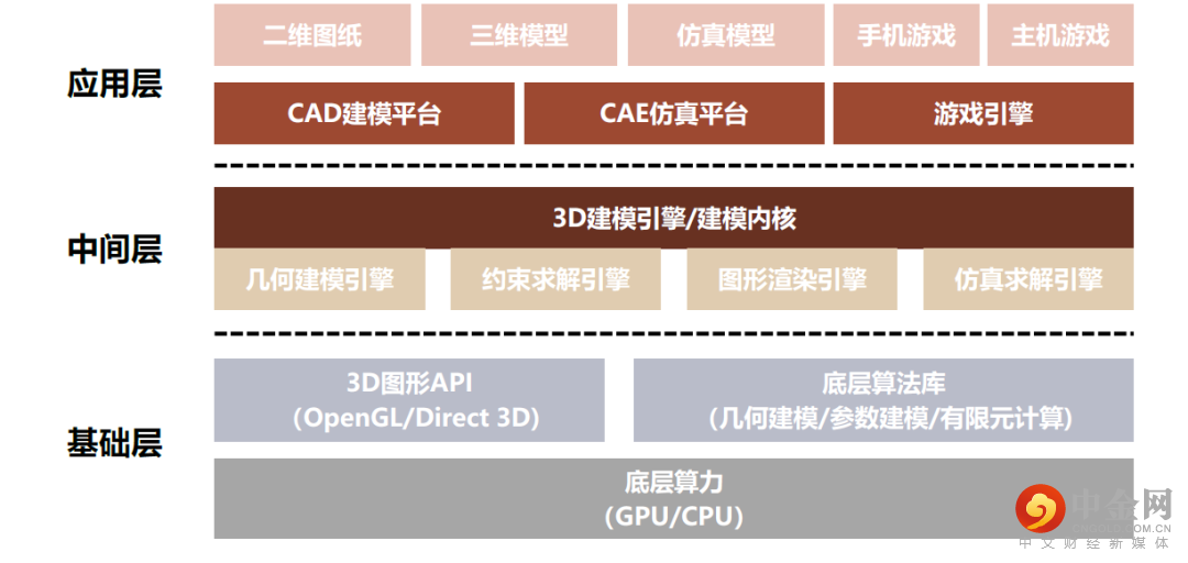 建模引擎是三维图形开发领域的基础“中间件”。建模引擎是基于算法及图形库的三维图形开发环境,为数字建模提供所需的几何建模、图形渲染以及仿真计算能力。在实际的应用中,建模引擎处于底层硬件算力资源以及上层应用之间的中间层,其负责通过3D图形API调用底层算力资源,实现数字建模对象的造型呈现,演化出在泛工业、泛娱乐场景的丰富应用。