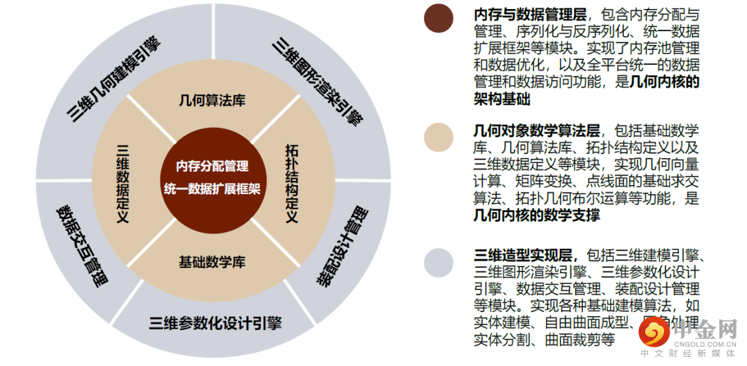 在泛工业应用场景中,提供几何建模能力的的三维建模引擎通常又被称为三维几何建模内核,成为CAX应用的核心底层内核。广义的三维几何建模内核囊括从底层的数据管理架构,到顶层的三维造型组件,从内到外又分为内存与数据管理层(架构基础)、几何对象数学算法层(数学支撑)、三维造型实现层,其中最外层的造型实现层就包括了几何建模引擎、图形渲染引擎、参数化设计引擎(包含约束求解引擎)等组件。三维几何建模内核为CAX应用提供了最关键的三维图形定义、建模、编辑能力,是构建三维CAX建模平台的核心。