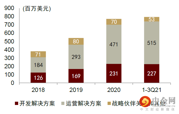 图表:Unity公司收入组成,2018年至1-3Q2021
