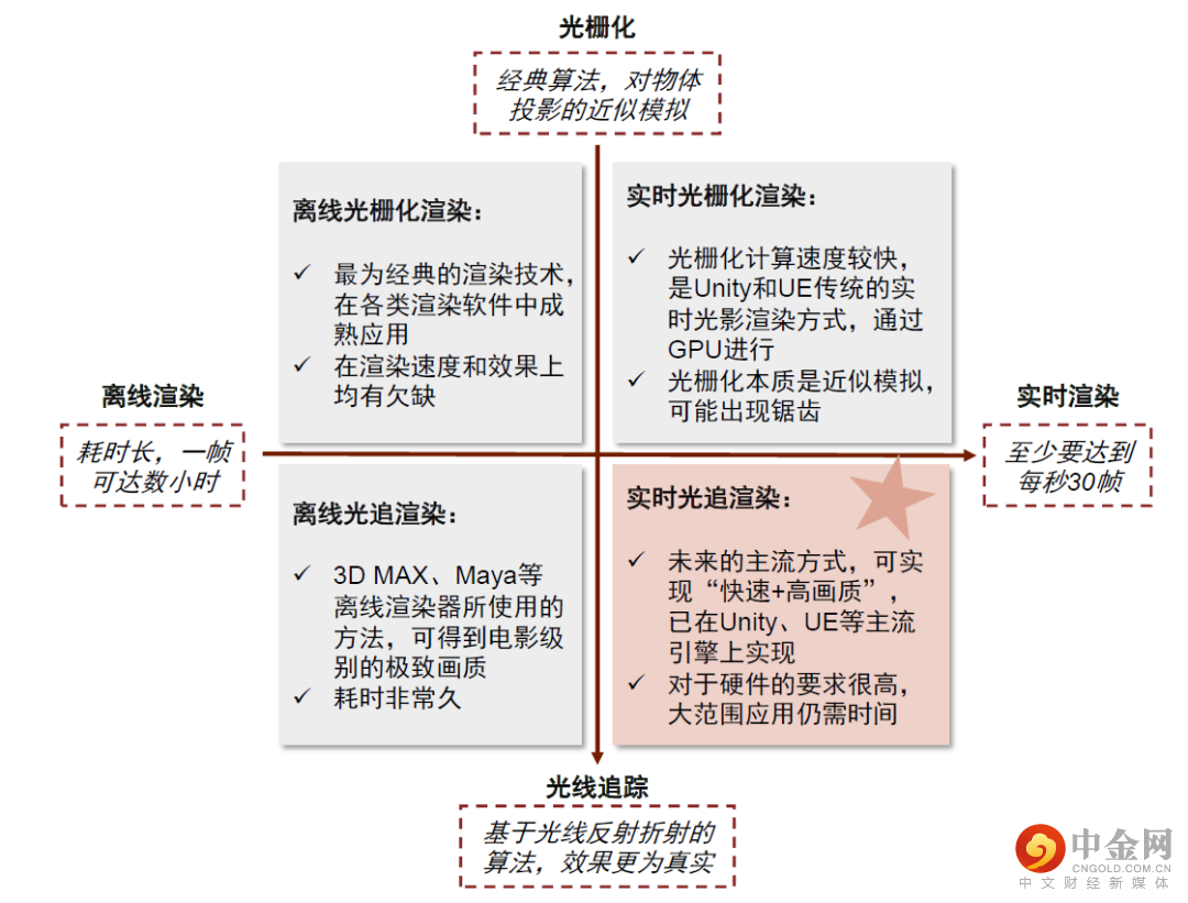 ►实时渲染:牺牲一定画质来交换效率的选择,主要应用于3D游戏、VR等强实时交互的场景。实时渲染指计算机边计算画面边将其输出显示,可以实时操控预览画面,在游戏、VR等强实时交互性场景中,用户与3D内容的实时交互需要得到及时的反馈,渲染速度需要达到1秒30帧以上,但对画面精度的要求不如影视作品。目前成熟的实时渲染模式是使用算法优化后的光栅化技术。由于GPU的并行运算特性更适合高速大量计算,光栅化实时渲染使用的是GPU加速的硬件渲染器。但随着硬件技术的突破,目前也可使用搭载了光线追踪模块的GPU来实现实时光追。
