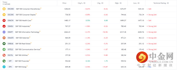 夜间,标普500指数的11个板块中除了金融(SPF)以及医疗保健(S5HLTH)板块录得小幅上涨以外,其余9个板块均全线下跌,其中能源(SPN)以及公用事业(S5UTIL)跌幅最大,分别为-2.54%和-2.53%。
