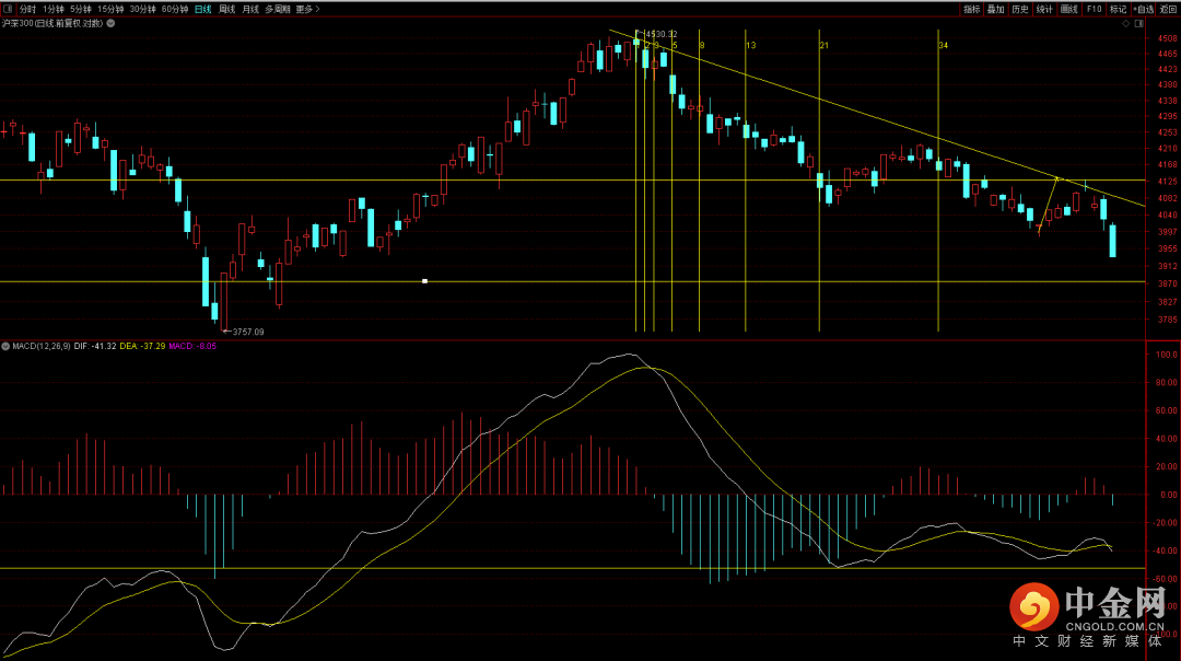 沪深300再次出现新低走势,短期量柱才刚刚放出,后续大概率还需要一段时间的调整,后续行情在没有突破下降趋势线之前大概率不会有大的上升行情,而从线段结构看后续行情有概率跌破前期3757点低点,在没有出现明显的突破二十天线走势之前谨慎重仓布局。