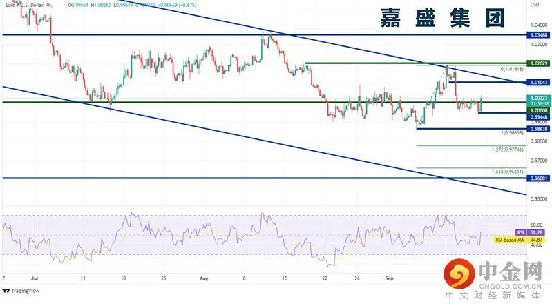 数据甫一发布,欧元/美元旋即上涨。加息100个基点的担心降温,推动货币对上攻平价。