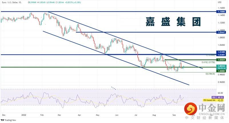 欧元/美元日图一直交投于2022年2月10日高点1.1498以来的下降通道内,下破1.0000并考验通道下轨趋势线支撑位之后,反击通道上轨趋势线所在的强水平阻力位1.0340附近。自那以后,货币对不断下跌并在0.9864创下20年低点。价格之后回升至8月10日高点到9月6日低点行情的61.8%回档位,即1.0176附近(那也是通道上轨趋势线所在)。欧元/美元回升后再度回撤,于9月13日回到平价,此后围绕该位震荡。