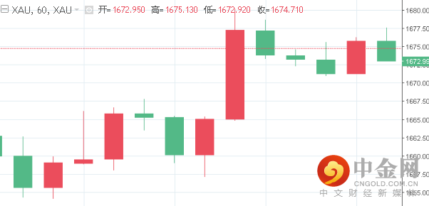 黄金开盘于1664.66,最高触及1680.28,最低探至1654.04,收于1674.05