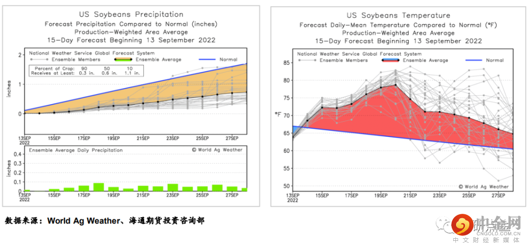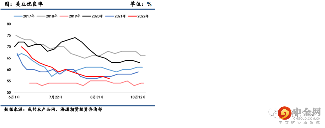 在旧作南美大豆减产,全球大豆供需格局偏紧的背景下,市场更加关注新作美豆产量是否能够修复全球大豆供应偏紧情况。美国农业部(USDA)在每周作物生长报告中公布称,截至2022年9月11日当周,美国大豆生长优良率为56%,市场预期为57%,前一周为57%,去年同期为57%。大豆结荚率97%,前一周为94%,去年同期为96%,五年均值为98%。大豆落叶率为22%,前一周为10%,去年同期为35%,五年均值为28%。8月美豆进入关键生长期,美国中西部地区高温干旱天气仍在持续侵扰作物的生长,因此在本月报告出炉前,市场就预计8月USDA预估的51.9蒲/英亩的单产水平无法实现,9月报告对单产超预期的调降也证明了这点。优良率本周不及预期也支撑了美豆价格的上涨。当前天气炒作窗口关闭,由于美豆丰产的预期一定程度上落空,在巴西大豆上市之前,全球大豆的供应仍然偏紧,预估中短期对期价起到支撑。