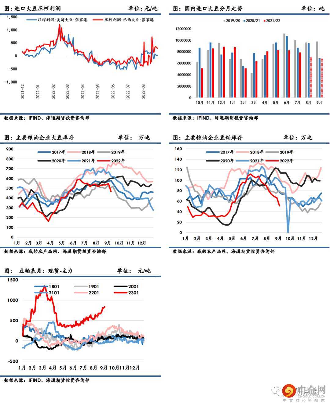 据海关数据显示,中国8月大豆进口716万吨,环比减少71.8万吨,减幅9%;同比减少232.6万吨,减幅24.5%。2022年1至8月大豆进口6132.9万吨,同比减少578.6万吨,减幅8.6%。此外,据Mysteel对2022年10月及11月的进口大豆数量初步统计,其中10月进口大豆到港量预计为540吨,11月进口大豆到港量预计为880万吨;9月份国内主要地区油厂进口大豆到港量预计共104.5船,共计约679.25万吨(本月船重按6.5万吨计)。进入到二季度后进口大豆压榨利润持续走低,打击了压榨商对大豆的需求,前期较低的榨利对应9月国内进口大豆到港量预期仍有所缩减,豆粕现货整体供应偏少同时临近国庆,下游备货积极,在豆粕表观消费量维持平稳偏强的情况下,豆粕库存短期或维持下降趋势,基差维持坚挺格局。