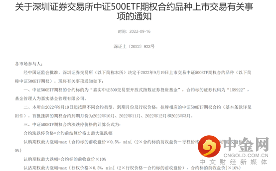 同日,深交所发布公告称,经中国证监会批准,深圳证券交易所决定于2022年9月19日上市交易创业板ETF期权合约品种。创业板ETF期权的合约标的为“易方达创业板交易型开放式指数证券投资基金”,合约标的证券代码为“159915”,基金管理人为易方达基金管理有限公司。深交所自2022年9月19日起按照不同合约类型、到期月份及行权价格,挂牌相应的创业板ETF期权合约。首批挂牌的期权合约到期月份为2022年10月、2022年11月、2022年12月和2023年3月。中证500ETF期权的合约标的为“嘉实中证500交易型开放式指数证券投资基金”,合约标的证券代码为“159922”,基金管理人为嘉实基金管理有限公司。深交所自2022年9月19日起按照不同合约类型、到期月份及行权价格,挂牌相应的中证500ETF期权合约。首批挂牌的期权合约到期月份为2022年10月、2022年11月、2022年12月和2023年3月。