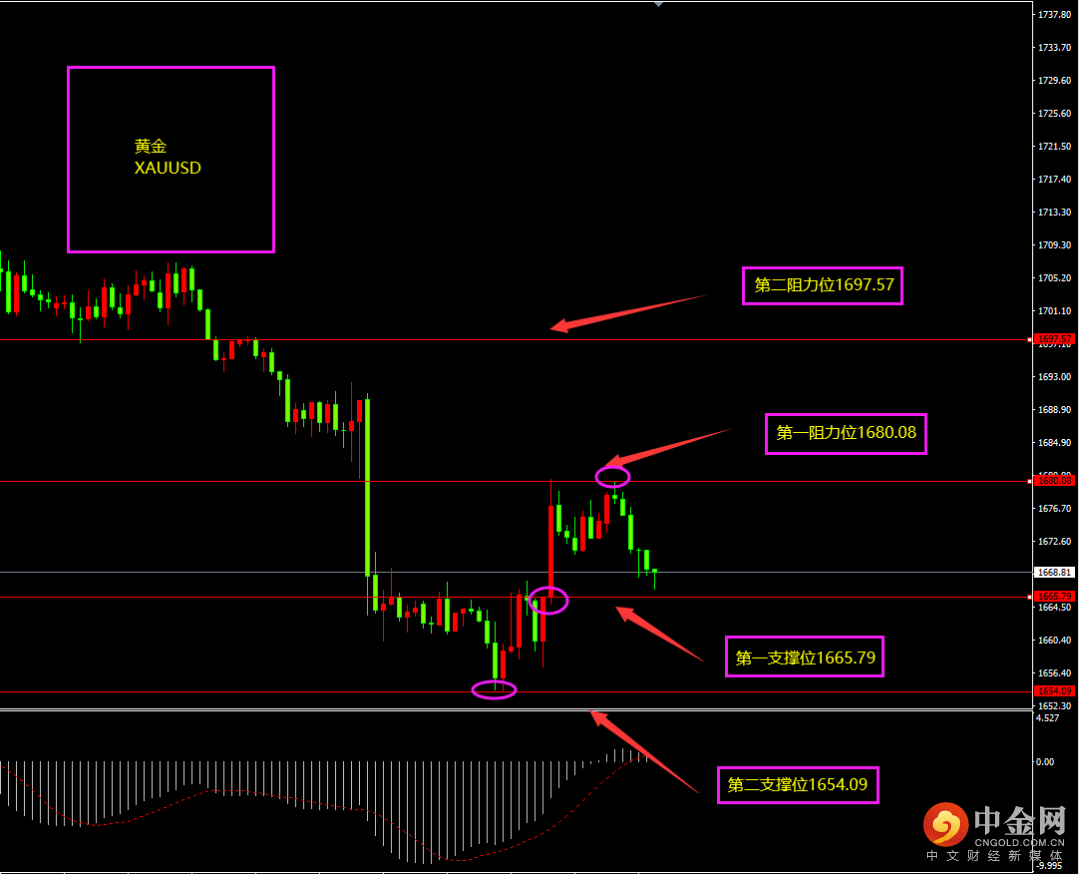 天图黄金收阳线,价格一度回落之后有所反弹,下行空头遭受多头反扑,短期下影线较长,空头有所减弱,随着多头的增强,日内更多以震荡以及震荡上行为主。小时图黄金期间连续阳线冲高,MACD转移至0轴之上,多头占优,短期上方虽有部分阴线下滑,但更多视为调整,调整之后更多以逢低看多为主?