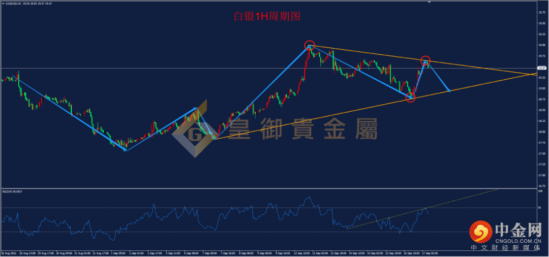 从下方白银1小时周期图看,白银上周五强势反弹,不断逼近前期高点,最终以日线中阳报收,今日亚盘时段受阻于1小时级别下行趋势线后,出现冲高回落,目前行情处于三角形整理态势之中。1小时级别RSI出现超买迹象,短线有望转为下行,重点关注上方19.70一线压力,这一位置为云图日线级别云层下边界重要阻力,如有冲高回落,可尝试布局空单。