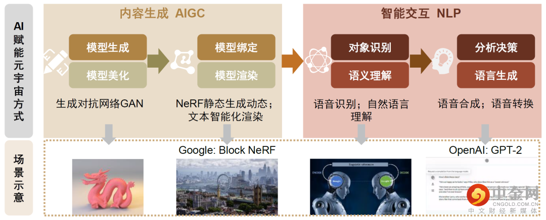 技术端:AI技术中AIGC+NLP双轮驱动,为数字世界内容生产和智能交互打下技术基础。