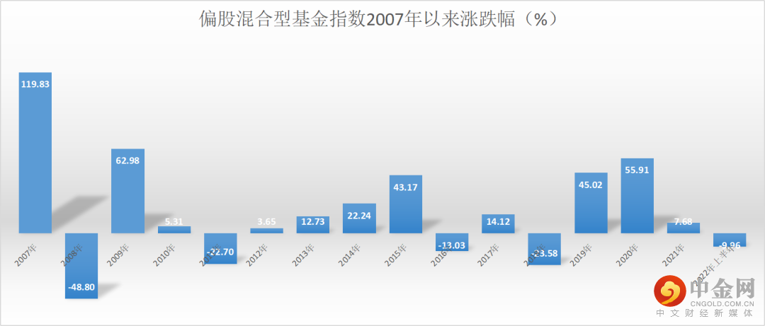 图表为2007年至2022年上半年,偏股混合型基金指数年度涨跌幅情况,数据来自wind,历史业绩不代表未来,市场有风险,投资需谨慎。