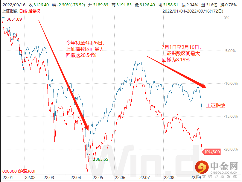 如上图,大盘涨跌来看,今年初至4月26日,上证指数区间最大回撤达20.54%,指数点位最低触及2863点;而今年7月1日至9月16日,上证指数最大回撤为8.19%,指数虽然跌破了3200点,但收盘价还在3126点。两相比较,虽同属低位,区别是263点的点位差,账户的盈亏情况或有差异。