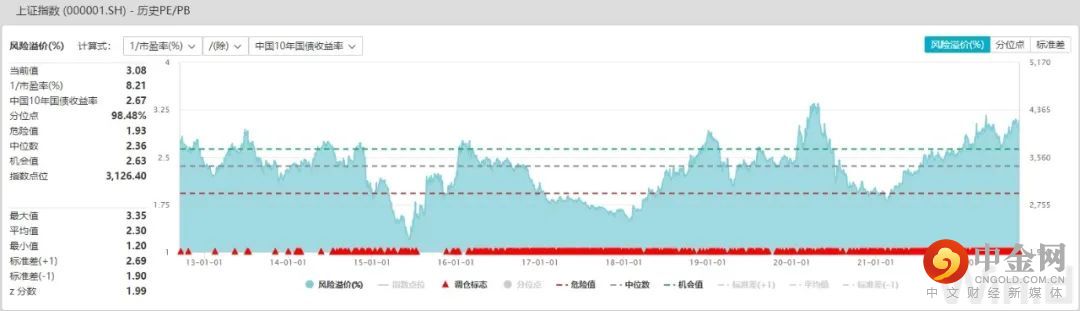 截图来自wind,截至9月16日,上证指数风险溢价比为3.08(1/市盈率(%)/中国十年国债收益率),位于近十年来98.48%分位。市场有风险,投资需谨慎。