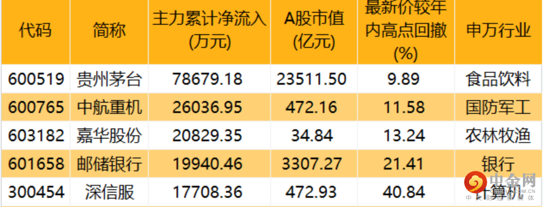沪深两市A股的主力资金净流出金额为163.98亿元,但51股近5个交易日持续获得主力资金净流入。净流入额最高的是贵州茅台,累计净流入7.87亿元。其次是中航重机、嘉华股份、邮储银行、深信服、农业银行等。