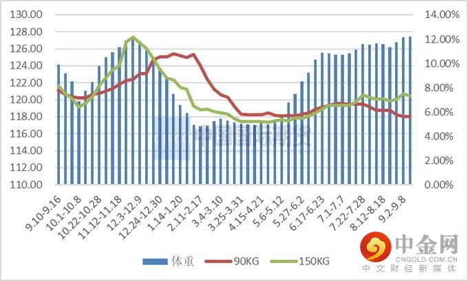 上周全国出栏平均体重127.44公斤,环比上涨0.04%,150公斤以上出栏占比7.32%,下降0.18%;90公斤以下占比5.763%,上涨0.02%。近期随着猪价再次走强,加上预期需求转暖,市场二次育肥增多,且多从100-120公斤标猪开始养大猪,前期二次育肥大猪循环出栏,成交均重有所上涨。