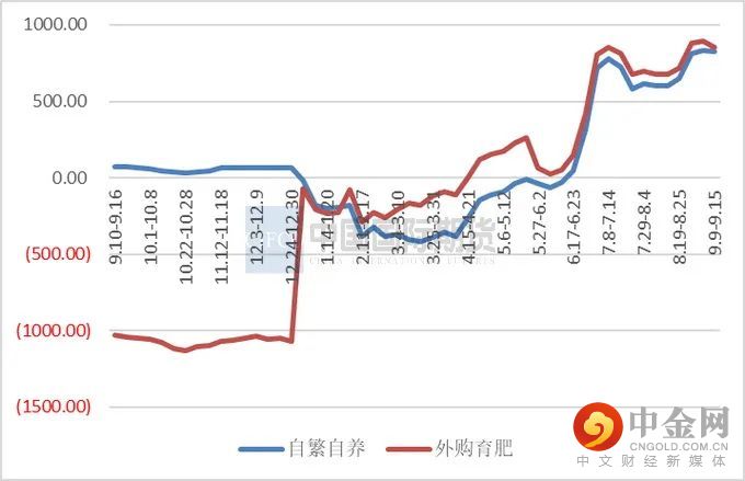 上周自繁自养周均盈利825.39元/头,外购仔猪盈利856.40元/头。周内生猪出栏价小幅下调,因此养殖利润缩减;外购育肥对应的购买仔猪价格处于上涨周期,外购仔猪和自繁自养利润差距缩减。