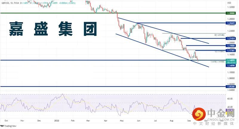 英镑/美元在2021年5月逼近1.4250之后不断走低,于2022年4月22日下破1.3000后加速下滑,大举走低并形成下降通道,于上周五创下1985年以来最低点1.1350。货币对目前徘徊于该位附近,而7月14日低点到8月1日高点行情的161.8%扩展位落在1.1417附近。如果价格继续下挫,下方支撑位先后有通道下轨趋势线1.1310附近、1985年低点1.0520。但请注意,RSI目前与价格背离,表明价格或准备展开短线反弹。上方阻力位先后有9月13日高点1.1442、8月26日以来高点1.1901、通道上轨下降趋势线1.2080附近。