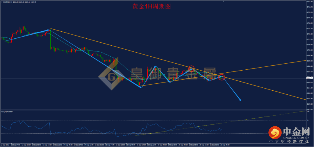 从黄金1小时周期图来看,黄金昨日冲高回落,并破位三角形整理下边界,同时1小时级别RSI跌破前期上行趋势线,空头趋势明显,目前行情正受阻于1小时级别布林带中轨,1小时级别以及30分钟级别云图均被跌破,压力在1667一线,并且多级别均为下降云,预示黄金下行并未结束,但同时需要关注1640一线斐波那契扩展线161.8%的重要支撑,今日可保持空头思路,如有反弹受阻可轻仓尝试空单。