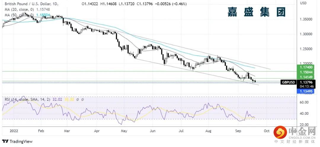 英镑/美元目前交投于数月下降趋势线,处于数十年低点1.14下方,而且RSI支持价格扩大下行。空头需要下破周图低点1.1350才有机会跌至1.13支撑位,而多头的目标是攻克9月7日低点1.1405后上看1.15整数位。