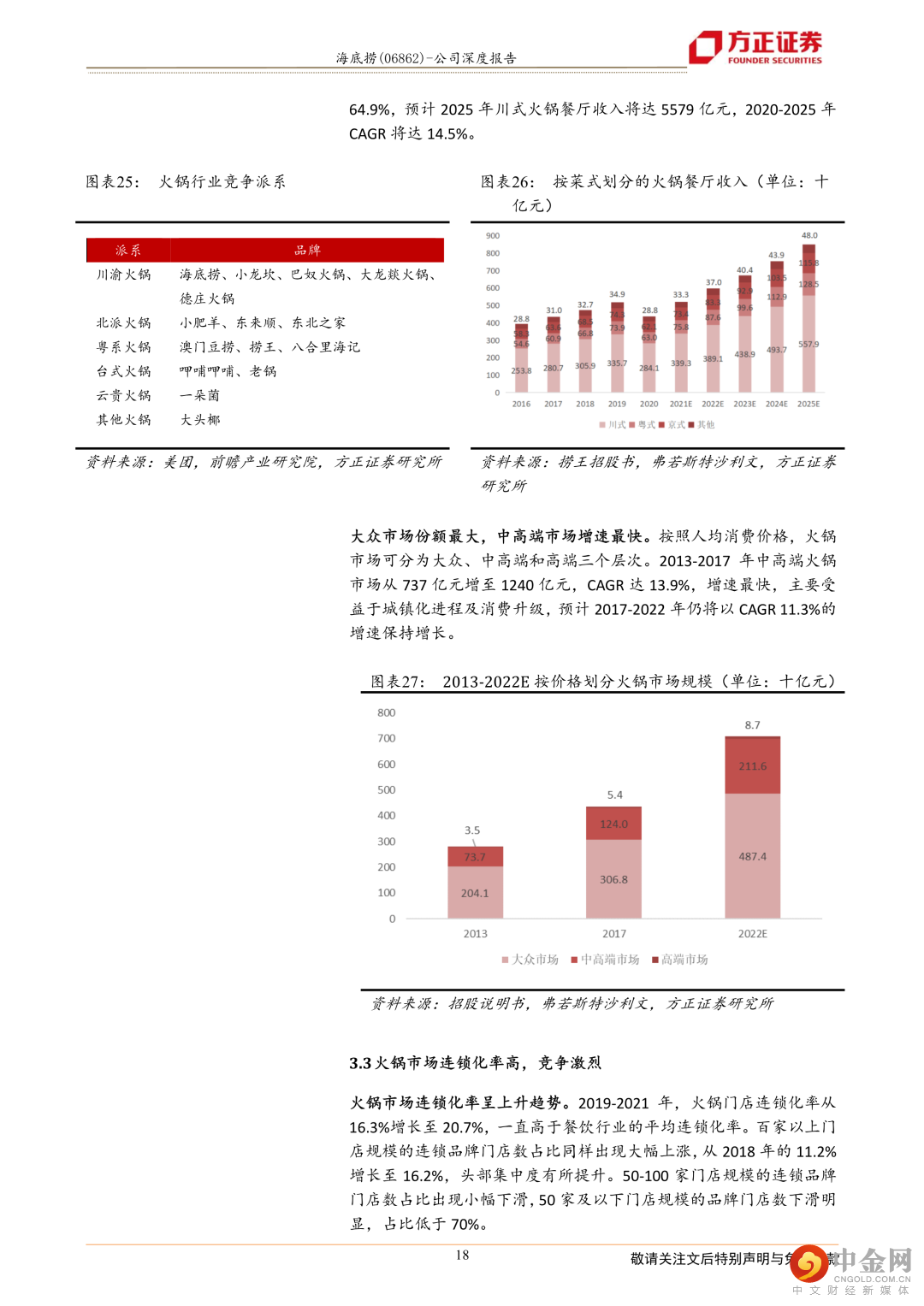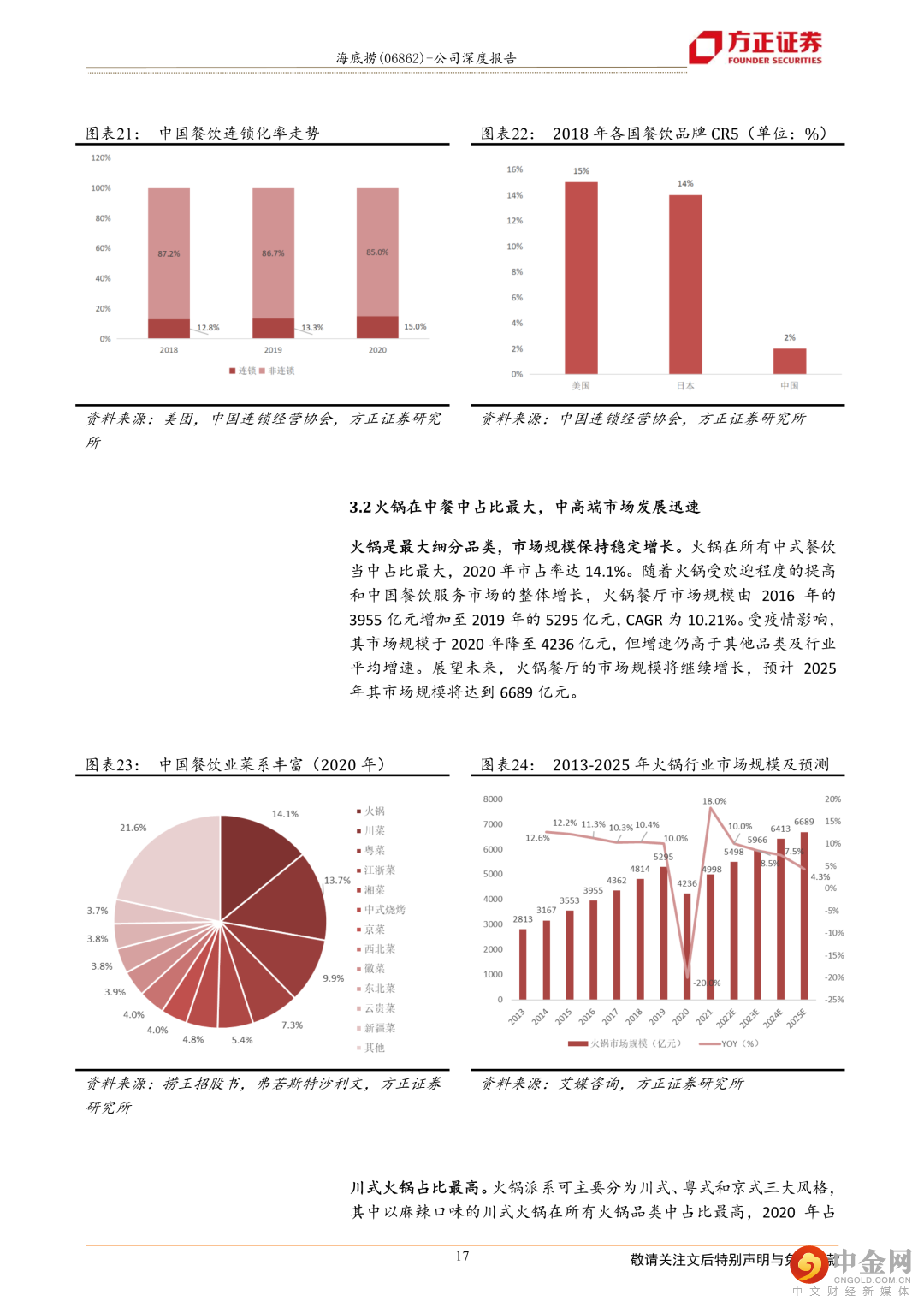 未来火锅行业仍然有较大增长空间,作为龙头更受益于行业扩容、集中度提升。2021年我国餐饮行业恢复至疫情前水平4.69万亿规模,其中中餐特别是火锅行业是其中最大的细分品类,预计2025年市场规模将达6689亿元。海底捞所属的川式火锅目前在所有火锅品类中占比最高,预计2025年川式火锅将达5579亿元。而当前火锅市场较为分散,在火锅市场连锁化率提升的大背景下,行业龙头海底捞有望充分受益于行业扩容以及集中度提升。