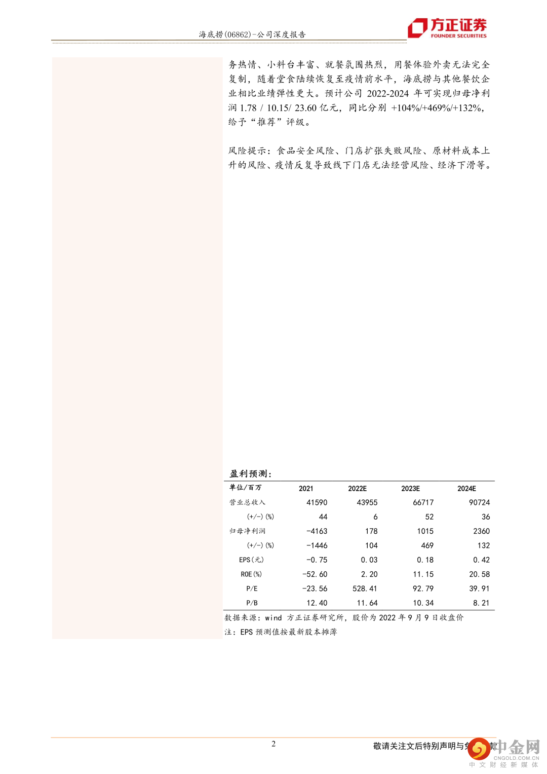 盈利预测与投资评级:餐饮市场空间大,公司作为火锅龙头有望充分受益于连锁化率与集中度的提升。预计公司2022-2024年可实现归母净利润1.78 / 10.15/ 23.60亿元,同比分别 +104%/+469%/+132%,给予“推荐”评级。