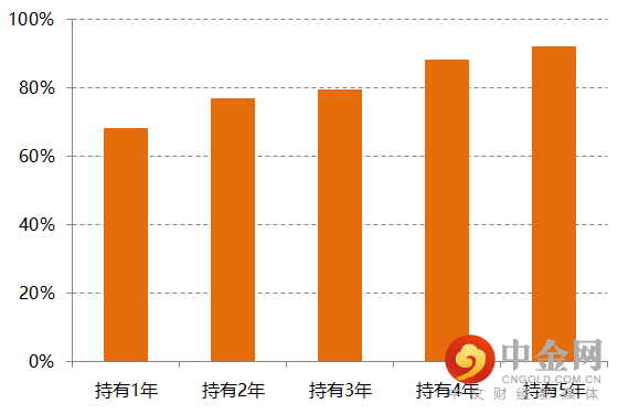 我们可以通过数据看到,随着持有时间的增长,获得正收益的概率也会明显增加。持有一年期的正收益概率为68%,一直到五年期的正收益概率胜率可以达到92%。长期持有的力量还是显而易见的。