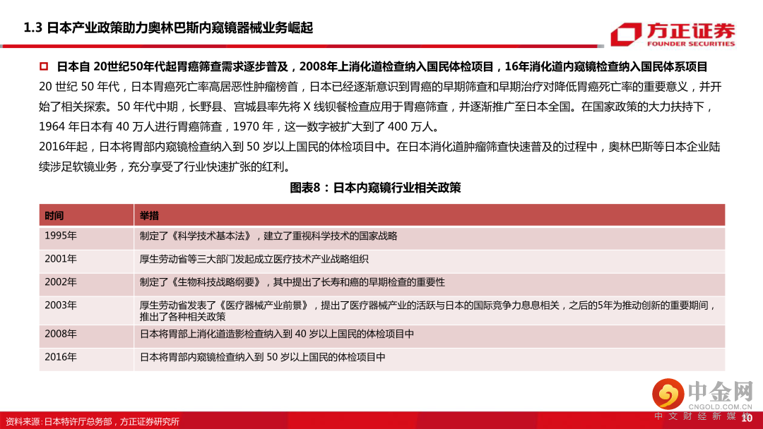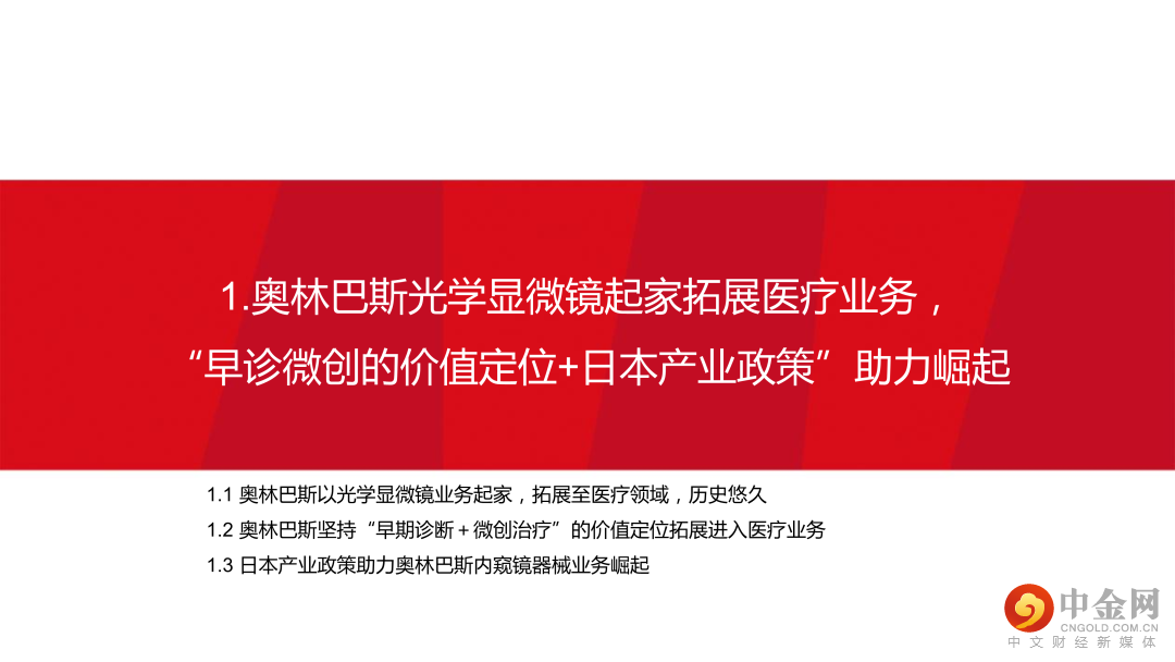 一、奥林巴斯光学显微镜起家拓展至医疗领域,“早诊微创的价值定位+日本产业政策”助力内窥镜医疗业务崛起:(1)奥林巴斯1960年开始发展医疗业务,较早地确立以胃肠内窥镜为核心的“早期诊断”和主要通过内镜诊疗设备和手术耗材实现的“微创治疗”两大价值主张定位。(2)日本自 20世纪50年代起快速普及胃癌筛查项目,在国家政策的大力扶持下,奥林巴斯胃肠内窥镜等业务充分享受了行业快速扩张增长的红利。到2021年奥林巴斯营收451亿元,净利润60亿元,目前市值1887亿元。