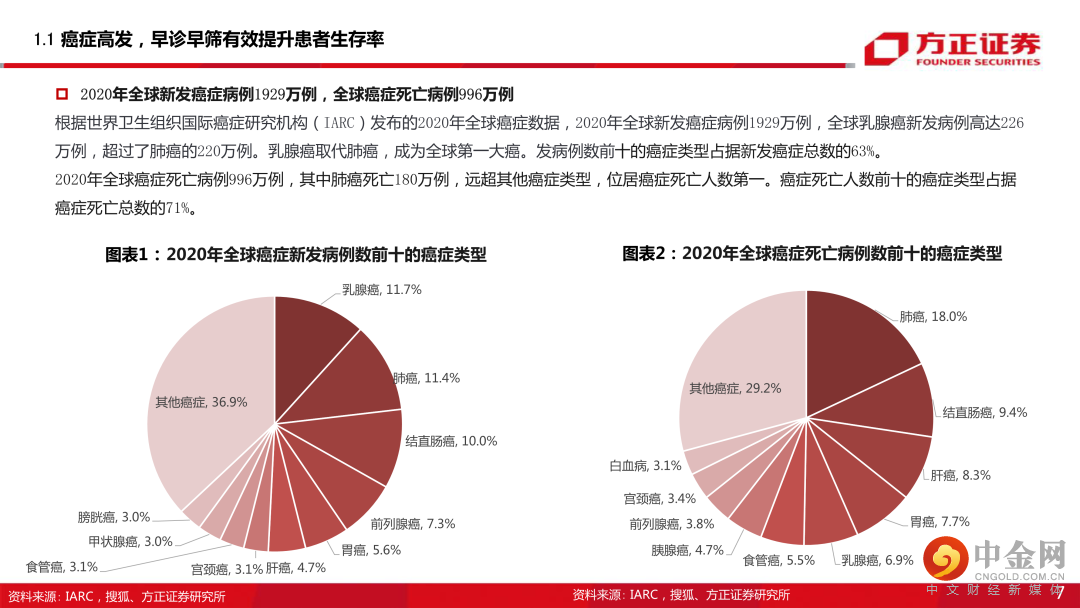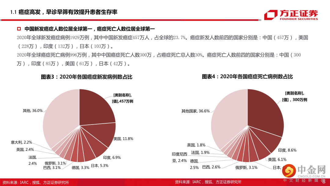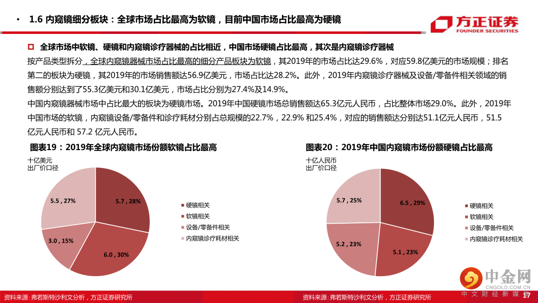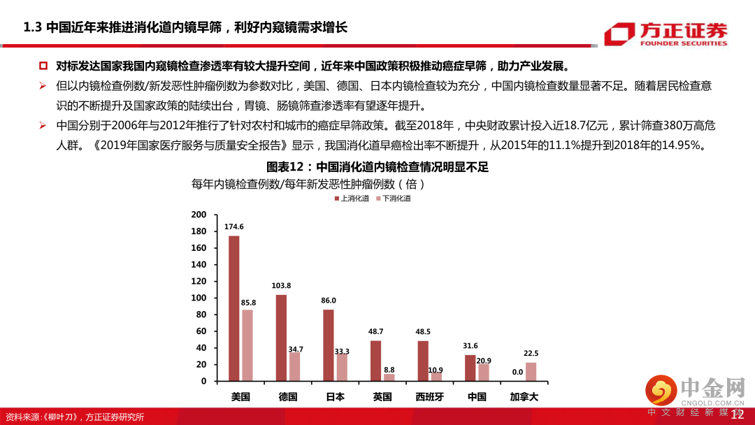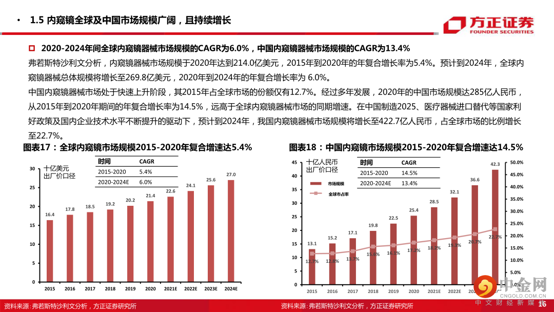 一、癌症早筛需求旺盛,政策助力内窥镜行业高速增长:根据弗若斯特沙利文数据,预计到 2024 年全球内窥镜器械总体规模将增长至 269.8 亿美元,2020 年到 2024 年的年复合增长率为 6.0%。中国内窥镜器械市场规模到2024年将增长至 422.7 亿人民币,占全球市场的比例增长至 22.7%。2020 年到 2024 年的年复合增长率为 13.4%。中国硬镜市场规模预计到2024 年将增长至 110.0 亿元,软镜市场规模增长至78.6亿元。