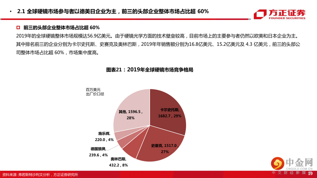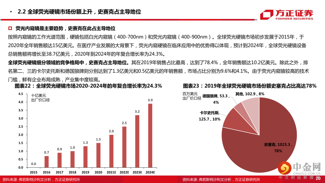 二、德美日企业瓜分全球硬镜市场,国产替代正当时:全球硬镜市场中卡尔史托斯、史赛克及奥林巴斯等欧美日企业占60%以上的市场份额,我们预测细分领域中荧光硬镜迅速发展,史赛克在此领域占主导地位,随着国内技术的快速发展,国内企业有望逐步打破进口品牌占主导地位的局面。