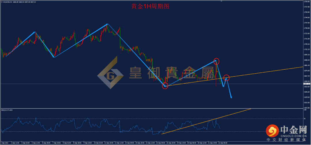 从黄金1小时周期图来看,黄金昨日在1654-1688一线宽幅震荡,最终冲高回落,目前行情跌破上行趋势线,整体再度走弱,从1小时RSI来看,黄金昨日两次触及前期上行趋势线破位反测阻力位,并成功展开下行,预计今日下方仍有下跌空间,可关注RSI超卖情况,点位上关注1640一线,这一位置为斐波那契扩展线161.8重要支撑,短线如有反弹可尝试空单。