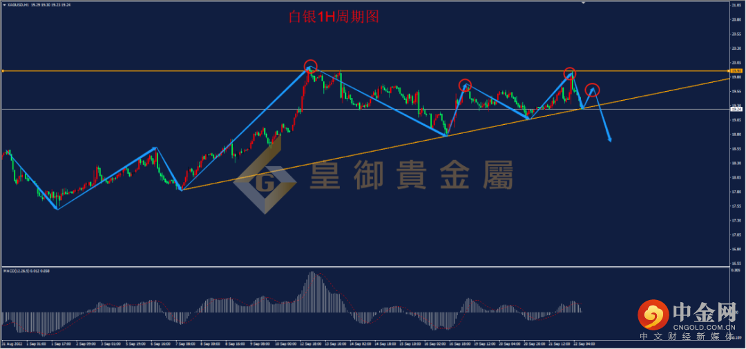 从下方白银1小时周期图看,白银昨日再度冲击前高附近后受阻回落,目前仍处于区间震荡行情之中,并且考验上行趋势线的重要支撑,如果这一支撑破位,则可能进一步打开下行空间,从30分钟MACD来看,顶背离出现,1小时级别RSI顶背离出现,短线空头可能延续,中线来看,由于日线级别MACD已经出现底背离,因此白银可能再度回踩之后,寻底反弹,目前可先尝试轻仓空单。