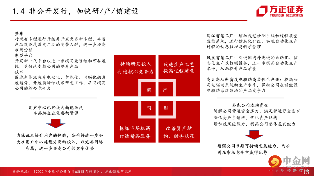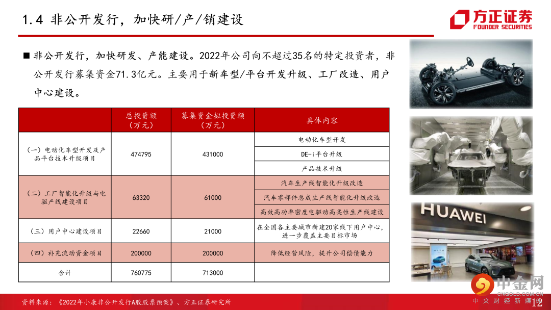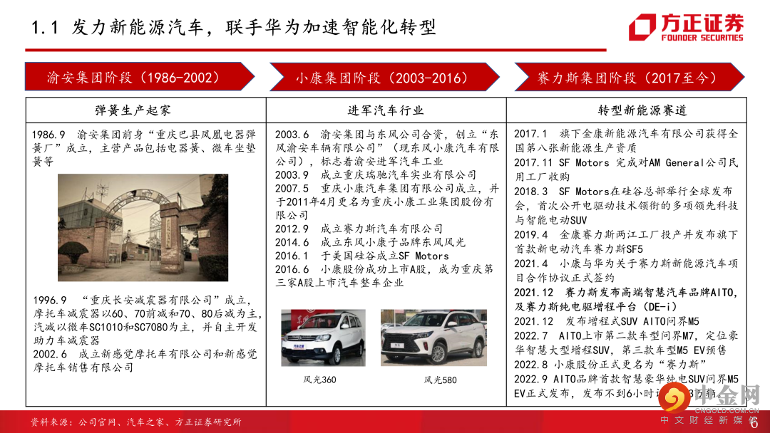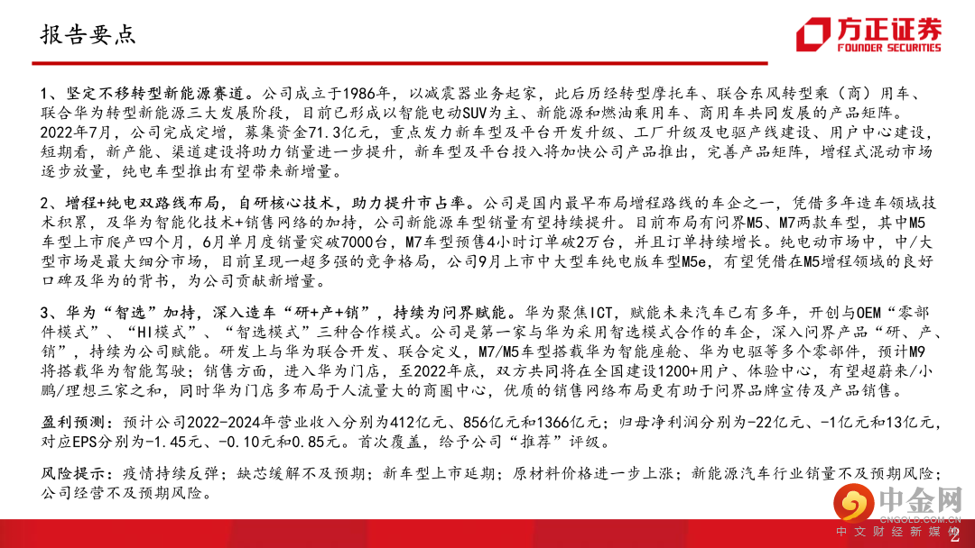 1、坚定不移转型新能源赛道。公司成立于1986年,以减震器业务起家,此后历经转型摩托车、联合东风转型乘(商)用车、联合华为转型新能源三大发展阶段,目前已形成以智能电动SUV为主、新能源和燃油乘用车、商用车共同发展的产品矩阵。2022年7月,公司完成定增,募集资金71.3亿元,重点发力新车型及平台开发升级、工厂升级及电驱产线建设、用户中心建设,短期看,新产能、渠道建设将助力销量进一步提升,新车型及平台投入将加快公司产品推出,完善产品矩阵,增程式混动市场逐步放量,纯电车型推出有望带来新增量。