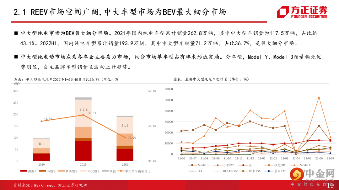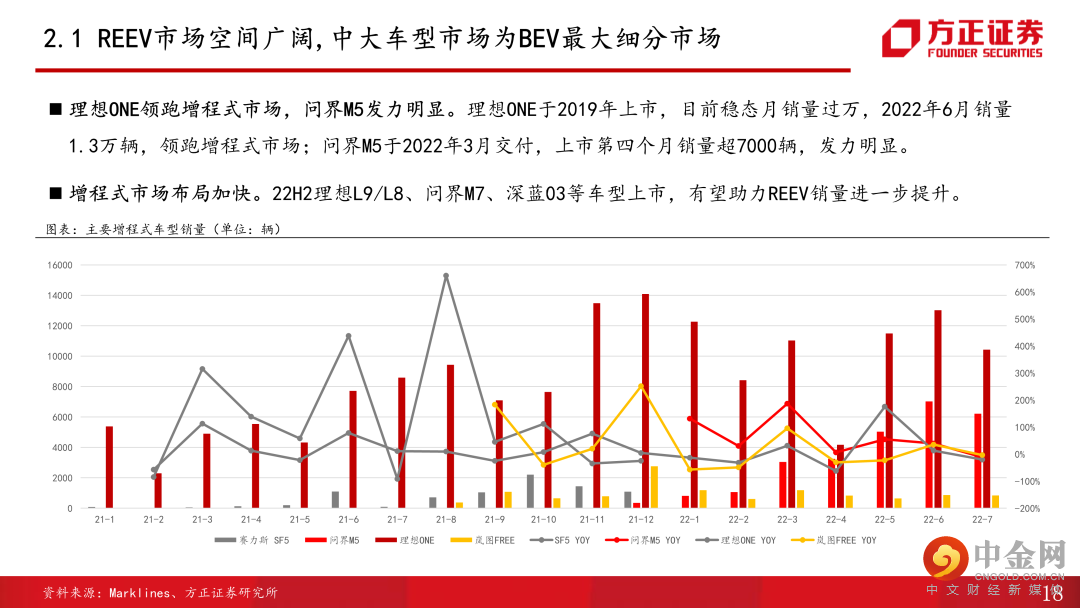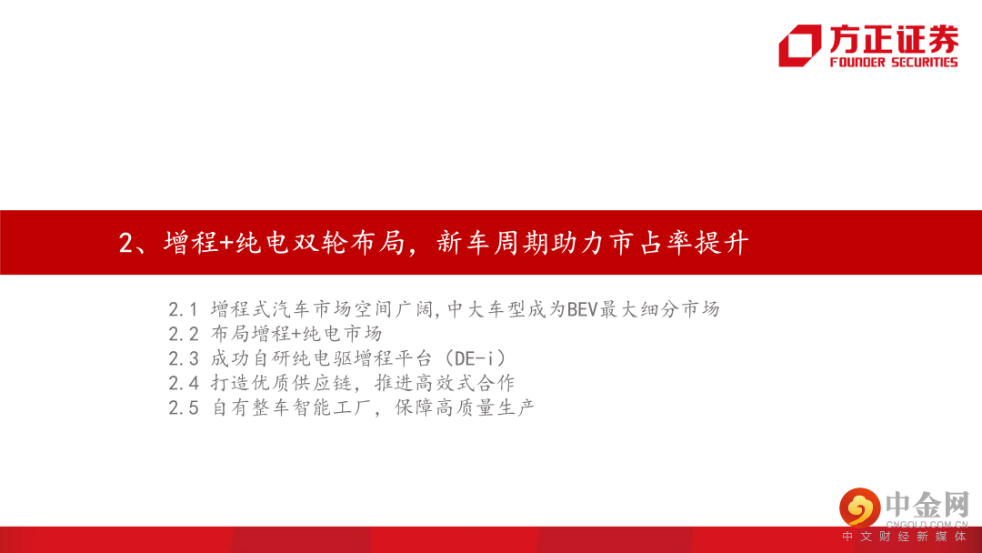 2、增程+纯电双路线布局,自研核心技术,助力提升市占率。公司是国内最早布局增程路线的车企之一,凭借多年造车领域技术积累,及华为智能化技术+销售网络的加持,公司新能源车型销量有望持续提升。目前布局有问界M5、M7两款车型,其中M5车型上市爬产四个月,6月单月度销量突破7000台,M7车型预售4小时订单破2万台,并且订单持续增长。纯电动市场中,中/大型市场是最大细分市场,目前呈现一超多强的竞争格局,公司9月上市中大型车纯电版车型M5e,有望凭借在M5增程领域的良好口碑及华为的背书,为公司贡献新增量。