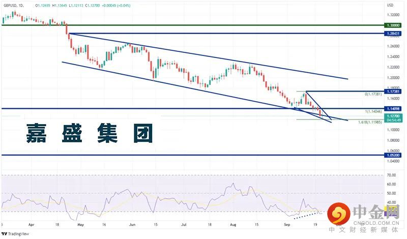 将英国的情况和美国的情况对比后我们认为,英镑/美元或许继续下跌。美国正在积极加息(FOMC昨天加息75个基点)且无惧经济衰退(严格来说美国经历了两个负增长期间,但美联储并不认为那是衰退),英国央行加息力度偏弱且担心经济业已衰退。在这样的背景下,英镑/美元不断走弱,日图自4月底到达1.2843附近以来形成了下降通道,在周三FOMC决定出炉后考验了通道下轨趋势线并在1.1235创下37年新低。另外,价格形成了下降楔形,周四也交投于其内。英镑/美元当天在1.1211形成下降的低点,但从楔形下轨趋势线回升。