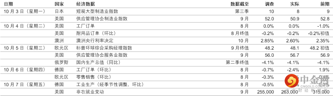 美国9月份新增263,000个非农就业职位,表现大致稳健,高于预期的255,000个职位。由于劳动力参与率下降,月内升幅足以将失业率推低至3.5%(预期升3.7%)。详细数据方面,工资增长保持在0.3%(环比)。整体而言,报告表现相对强劲,将促使联邦公开市场委员会(FOMC)官员专注于降低过剩需求,致力使通胀降至接近2%(同比)的目标。9月份供应管理协会制造业采购经理指数降至50.9,低于预期的52.0。调查的整体指标至今已回落11个月,因美国决策官员积极提高利率以遏止通胀,且地缘政治动荡,继续使环球贸易需求受压。新订单(47.1)和就业(48.7)增长回到收缩水平,生产(50.6)和积存订单(50.9)分项指数仍处于扩张水平。随着需求放缓,价格分项指数也进一步跌至51.7,与六个月前的87.1相距甚远。由于经济前景欠佳,调查机构表示,公司开始通过自然流失减少职位,但尚未采取裁员措施。9月份供应管理协会服务业指数微跌0.2点至56.7,略高于预期的56.0。活动指针整体保持稳定,而投入价格(68.7)继续有改善,受惠于政策官员积极收紧政策,使过剩需求放缓。月内商业活动(60.9)、新订单(61.8)和就业(50.2)均有所增加。如预期所料,工厂订单上月从多年高位跌1.0%(环比)后,8月份表现停滞。全球需求放缓和货币政策急剧收紧造成不利影响,预期美国的制成品订单将进一步减少。